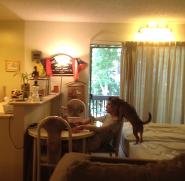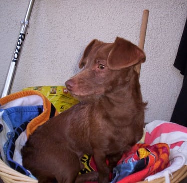 It didn't take long for Choco to grow into his new habitat. He gravitated towards the balcony. There he could look down upon the trees and the grass. He could get some sun, breath fresh air, and most importantly, he could bark at any squirrels that dared annoy him. Choco's incessant campaign against the squirrels of Old Orchard would go on unabated for the years to come.