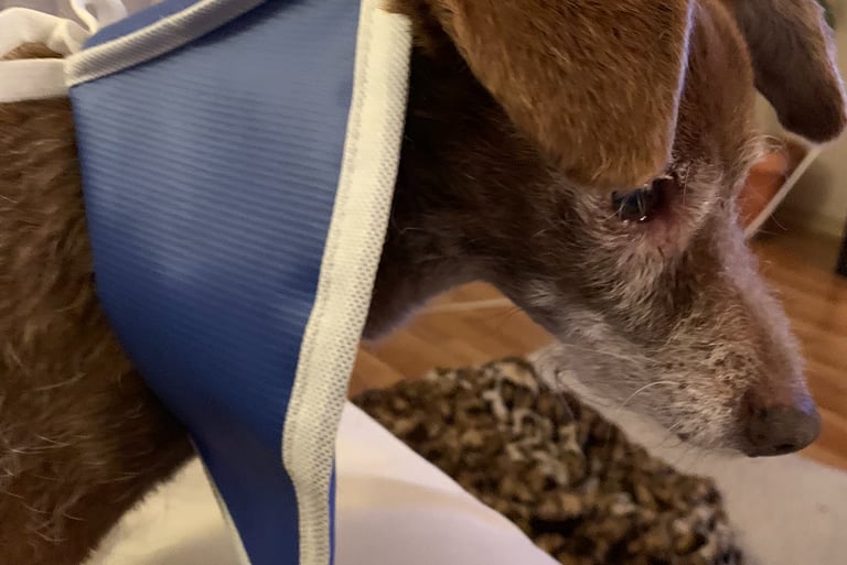 Other issues started popping up. After years of managing to walk around in his weakened state, Choco had greater difficulty doing this and was forced to resort to dragging himself around. He would drag his behind around the floor, and this over time had caused a bulge to build up. We wrongly suspected it could be cancer, and even though it thankfully wasn't, it still caused issues for him. We had to take him to the vet and give him medicine.
